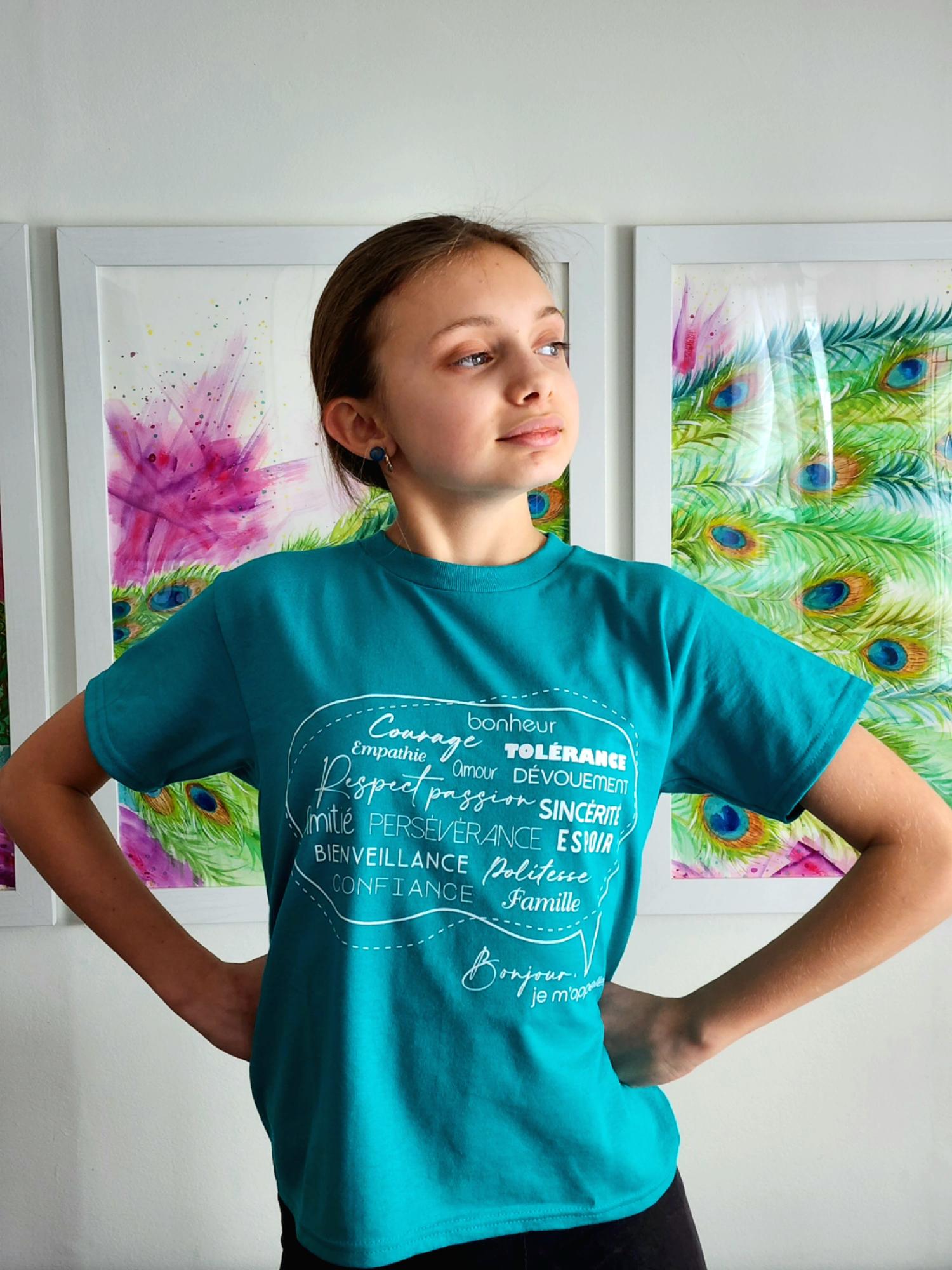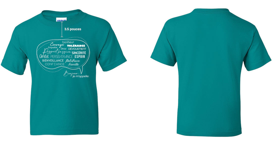 Chandail à manche courte modèle ENFANT de couleur "jade dome" (pour avoir une bonne idée de la couleur, svp vous fier à la photo du chandail recto/verso)