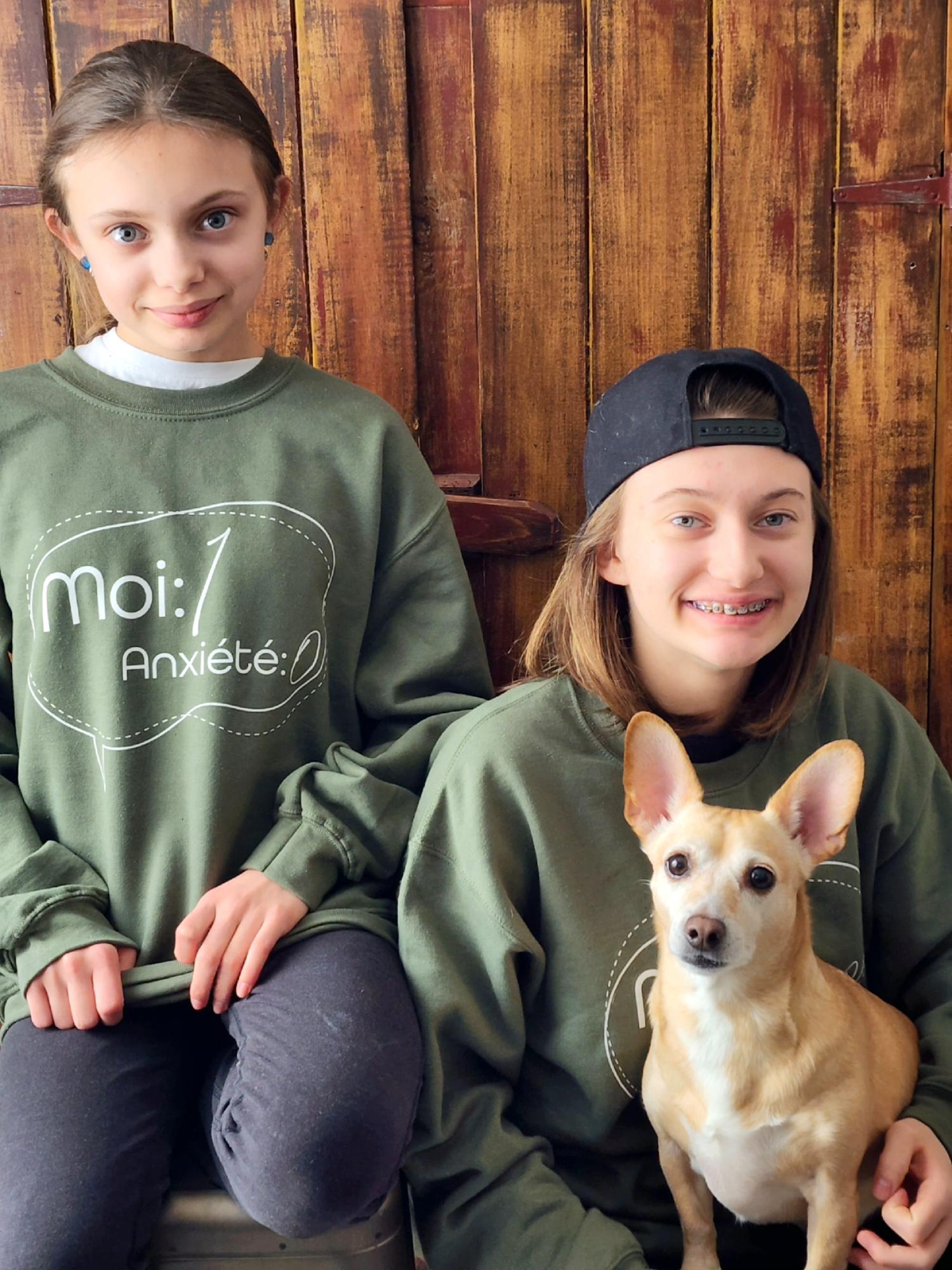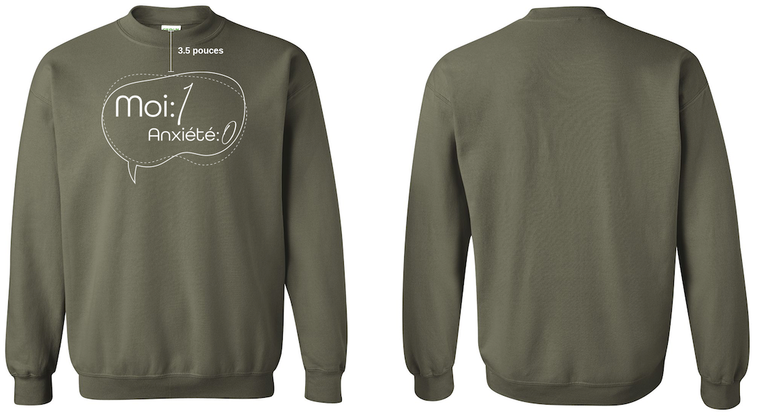 Coton ouaté ras le cou de couleur vert militaire (pour avoir une bonne idée de la couleur, svp vous fier à la photo du chandail recto/verso)